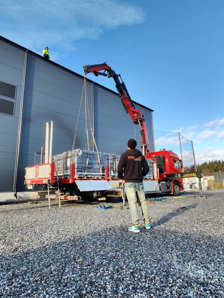 Fredagen började med ett ösregn när vi skulle lasta upp bilen på vår terminal i Täby och bege oss mot Huddinge för att lyfta upp solpaneler på taket – men väl på plats sprack himlen upp och solen tittade fram lagom till det var dags att börja lyfta.